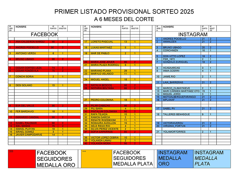 Hola a todos, como otros años para estas fechas, adjunto el primer listado, a 6 meses del corte, de los seguidores que entrarían en el sorteo 2025 si se cerrase hoy, para que podais ir valorando vuestras posiciones. Respecto a Facebook, tal como os indiqué, los 25 seguidores medalla de oro jugaran con 2 boletos y los 20 medalla de plata con 1. Atencion que este año al no haber medalla de bronce entraran menos seguidores por lo que la puntuacion [...]